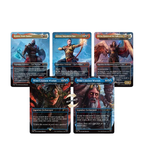 After carving a path of vengeance through Mt. Olympus, Kratos wandered for many years—eventually making his way to the mysterious Norse lands. Following the death of his wife, Kratos and his young son, Atreus, embark on a journey to honor her final wishes, entangling them with the Aesir gods and leading them on a path to eventually face the cataclysmic event of Ragnarök. Empower the father and son duo on the battlefield through Teferi’s Ageless Insight as Mimir (the reversible treatment allows you to play either Mimir-in-a-tree or Mimir-as-a-head) and Iroas, God of Victory given form as the indomitable warrior, and “Freya, Queen of the Valkyries.”